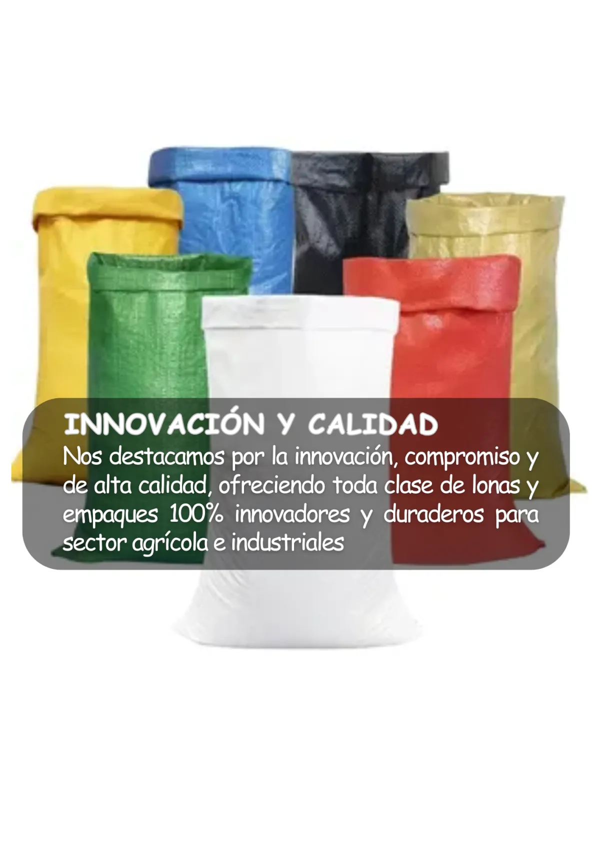 Nuestro portafolio integral incluye empaques en polipropileno, yute, big bag, fique (nuevos y de segunda), cabuyas, saco de malla (leno), hilos de poliéster, algodón y rafia, así como bolsas tejidas y con impresión a color personalizada de la más alta calidad.